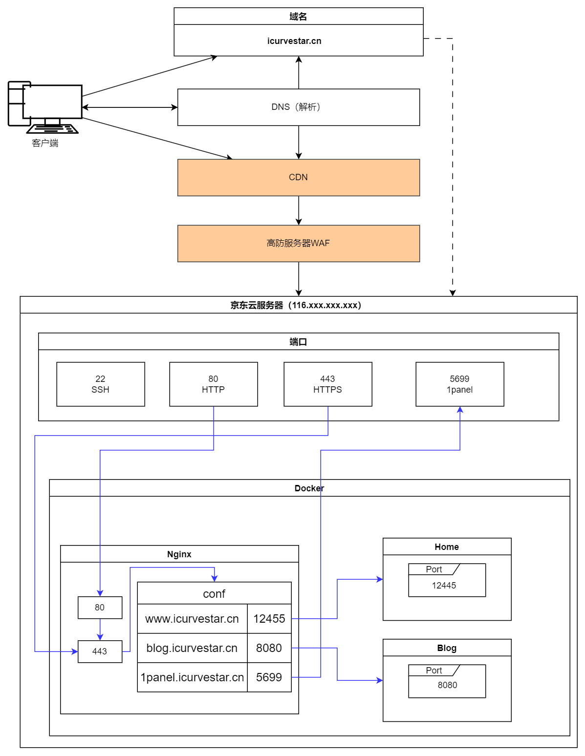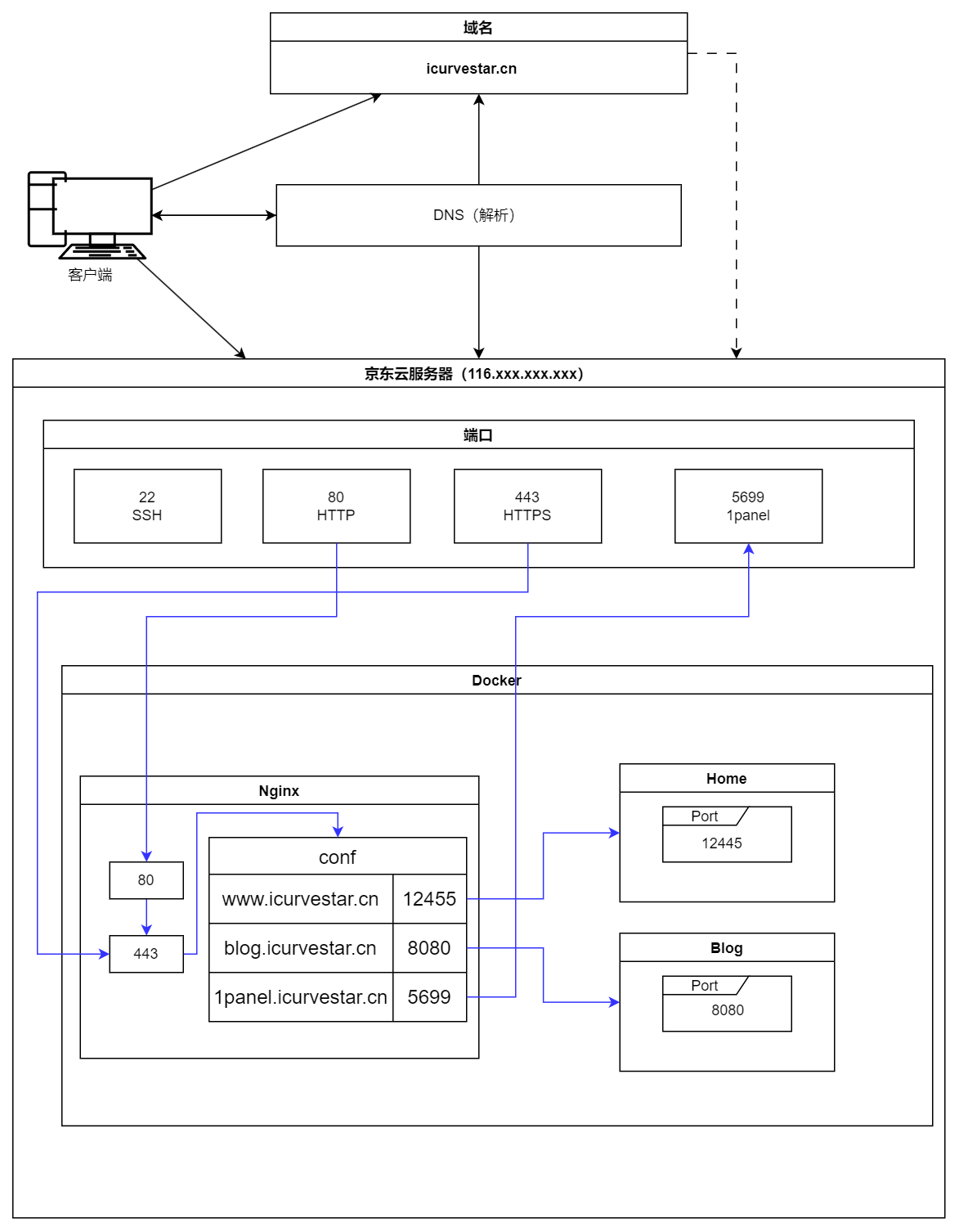 目前我的业务一开始有3个,分别是主站的个人页,博客、1Panel服务器管理面板。