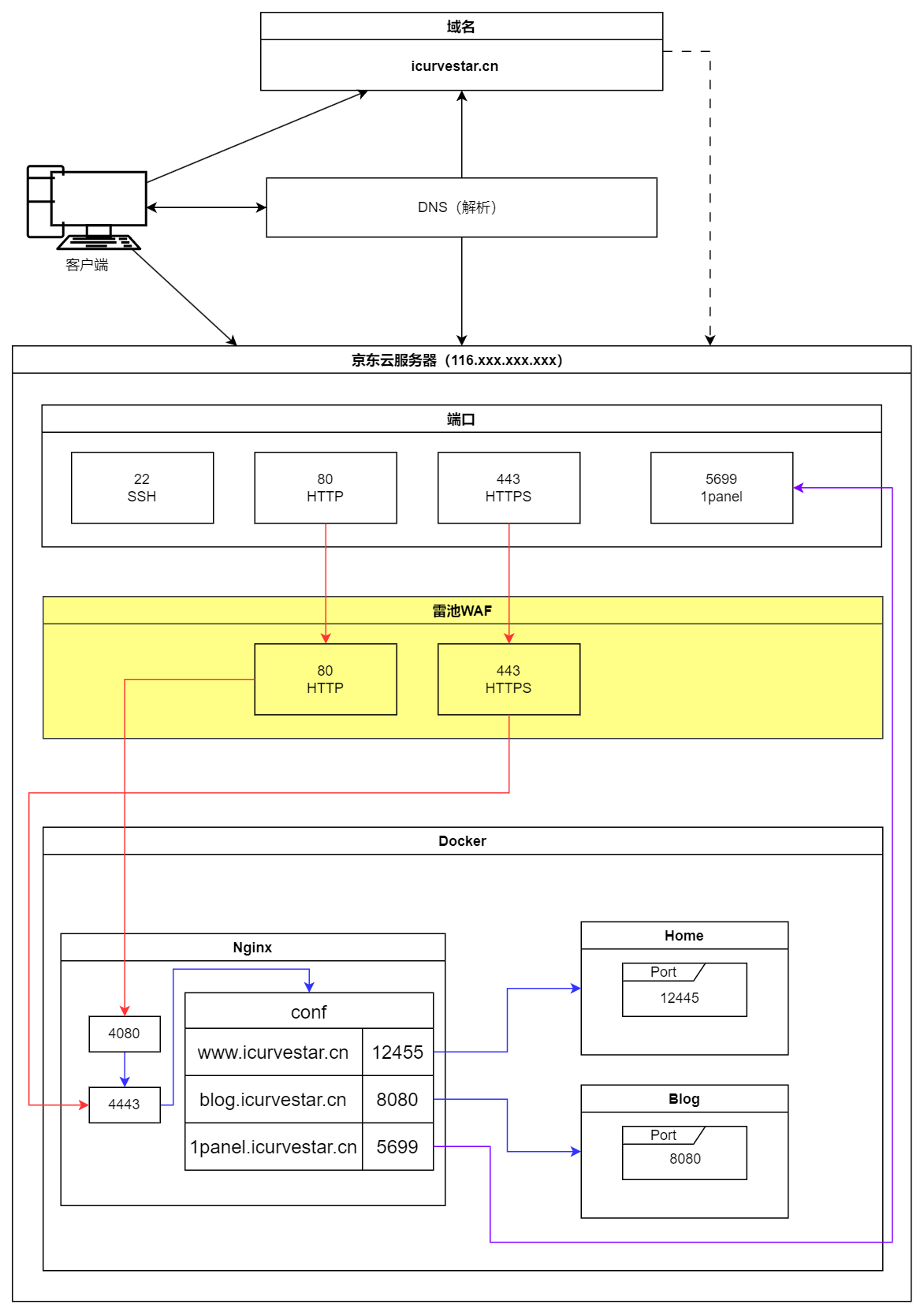 高防服务器费用对于普通个人网站来说难以支撑,可以选择自己在一台专门的服务器上部署一些免费的WAF,比如雷池WAF、堡塔云WAF。有多预算的情况下不建议源站服务器上运行WAF,不然单机的负载更高、设备宕机的概率更大。